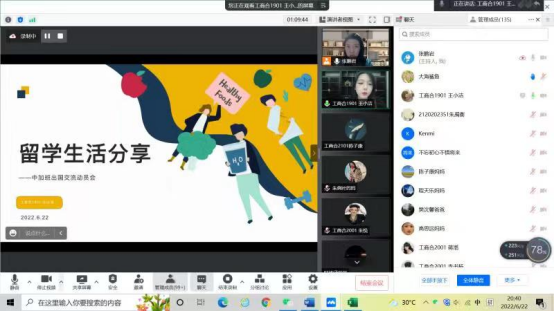 副院长蒋琰、中加班班主任文婷、外事秘书喻洁、辅导员张鹏岩出席本次会议,出国生代表、全体20、21级工商管理(环境商务)专业学生及家长参加了本次会议。会议由张鹏岩老师主持。