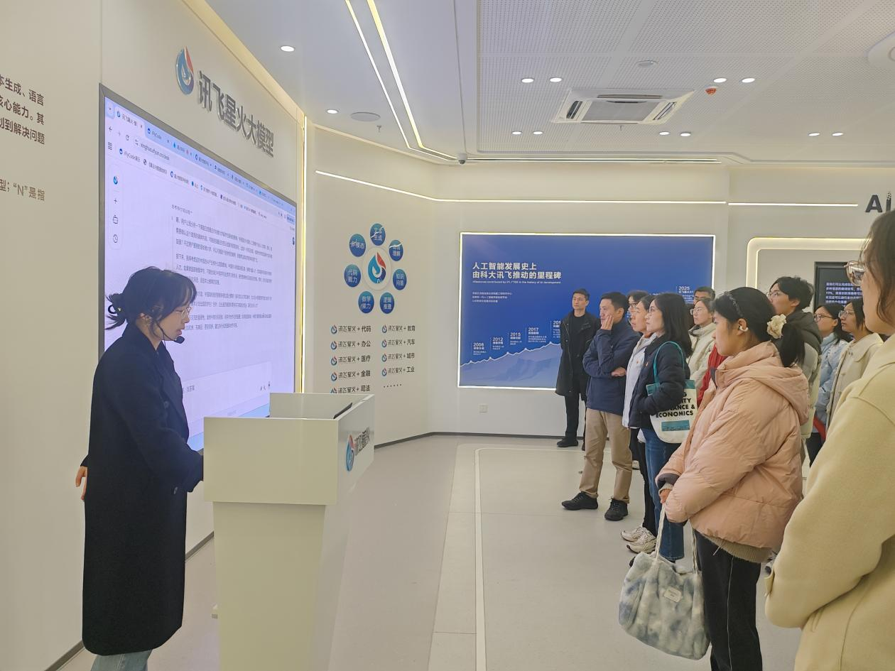 在人工智能体验馆,师生系统了解了语音识别、机器翻译、智慧教育、智慧医疗、智慧城市等前沿技术成果。参观过程中,师生结合工商管理学科背景,围绕“AI与企业管理融合”“智能驱动产业升级”“数字员工与人力资源变革”等议题展开交流,深刻体悟科技自立自强所承载的国家战略意义。