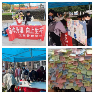 在中苑食堂门口举办“防诈为壤,向上生花”反诈小知识换花活动,同学们通过留下一个预防电信诈骗小方法,便可以换取小“商”店里一朵美丽的花。活动举办期间,现场热火朝天,气氛活跃,同学们都踊跃参加,很快反诈宣传板上就贴满了小纸条。