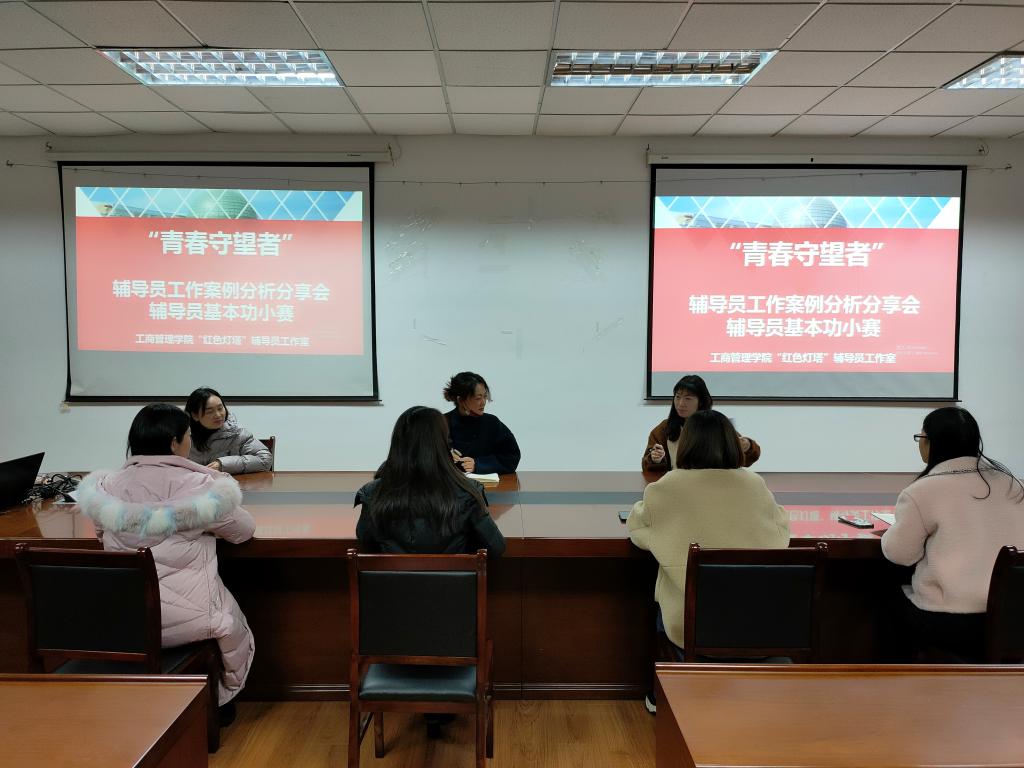 “红色灯塔”辅导员工作室在德济楼408举行“青春守望1+1”辅导员案例分析分享和基本功小赛,工作室全体成员参加活动。