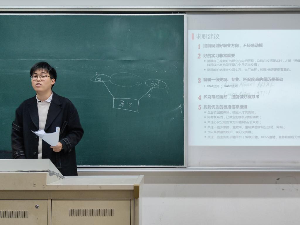 交流会上,三位同学嘉宾依次上台讲话,他们从摆正就业心态、明确求职目标和笔试面试准备等方面分享在求职过程的经历。首先,陈相国同学简明扼要的分析了目前的就业形势,并以自己的就业岗位为例子,指出在求职过程中保持良好心态的重要性,鼓励同学们做好自我审视、积极参加校园创业项目,为求职做好充分的准备。随后,周颖同学为大家分享了公务员备考的经验,她从考前准备、笔试学习、面试训练以及个人感受四个方面出发,详细讲解了自己备考全流程的宝贵经验,鼓励大家在备考过程中注重身心健康、提高学习效率,做到有积累、有成长、有坚持。最后,由张婧盈分享在国企的求职经验,她从如何求职抓住时机这一关键点入手,指出秋招是企业招聘的最佳时间,建议同学们一定要提前准备,及时了解企业招聘信息,争做有准备的先行者,抓住机会、抓住未来。整场分享干货满满,让同学们受益匪浅。