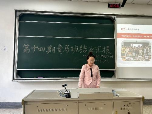 党委副书记尹海燕老师进行总结发言。她对本期青马班学员在结业汇报中展现出的优秀综合素质给予肯定,对各小组全面展现成员的个人学业发展、志愿服务实践、学科竞赛参与提出表扬。此外,尹海燕老师也对大家提出两点期望:第一,希望各小组在参与青马班活动之余积极主动组织马克思主义思想理论学习和实践活动,将理论学习贯彻到个人的学习生活中;第二,希望学员们做好马克思主义的传承者和传播者,努力投身学业和各项高质量学科竞赛,将在青马班的所学所知应用到实践中,将个人发展和学校、学院发展相结合,将个人理想融入实现中华民族伟大复兴的中国梦。