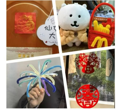 在这场充满传统韵味的迎新年活动中,非遗剪纸和扭扭棒手工制作是传递文化的重要载体。同学们热情参与,创作出寓意吉祥的剪纸作品,并用扭扭棒制作了中国结、红灯笼等手工艺品。在动手实践中,他们深入了解我国传统节日习俗,将民间传统文化与现代创意巧妙融合。本次活动既是对传统文化的传承,也是对新年美好祝愿的传递。