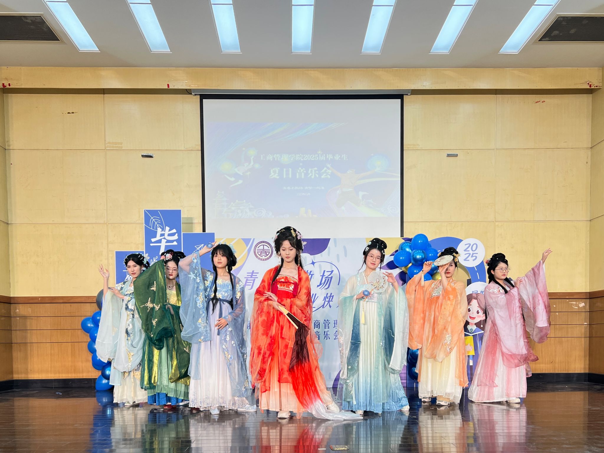 活动伊始,副书记尹海燕对2025届毕业生送出了诚挚的祝福,祝愿毕业生们在未来的人生道路上,一路坦途,前程似锦。随即,油画棒乐队以一首《寄往未来的信》点燃全场,青春的热血与梦想,在这充满活力的表演中,被诠释得淋漓尽致。紧接着,舞台迎来传统与现代的精彩碰撞,古典舞《星河叹》以柳枝般的柔美身姿勾勒星河画卷,汉服社《折柳》用广袖襦裙演绎千年风雅,陈逸以高难度钢琴独奏曲目《肖邦英雄》,让黑白琴键流淌出灵动的现代韵律。