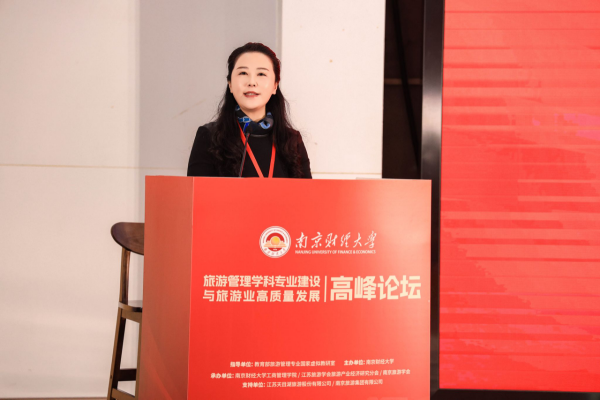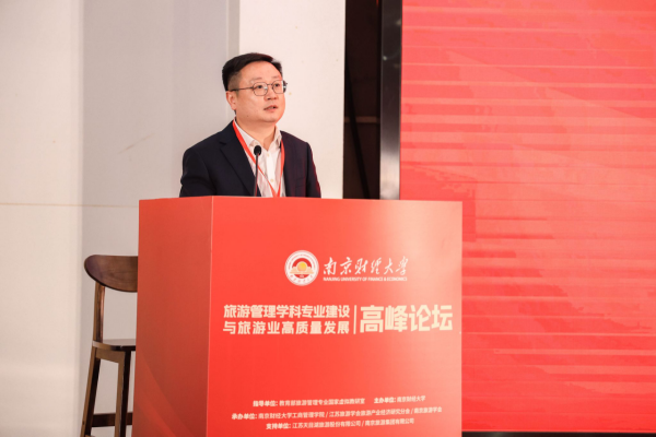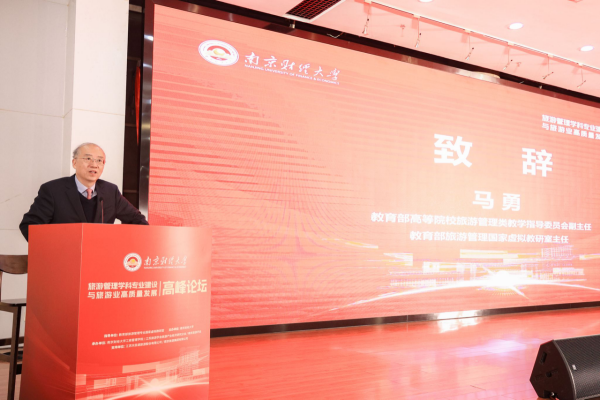 教育部高等院校旅游管理类教指委副主任、教育部旅游管理专业国家虚拟教研室主任、湖北大学马勇教授致辞。他肯定了南京财经大学旅游管理专业在学科建设、科研创新、人才培养、社会服务等方面取得了显著成绩并表示,本次高峰论坛为旅游学界和业界提供了交流学术思想、探讨前沿问题的平台,展现了南京财经大学在旅游学科建设与行业引领方面的责任担当与前瞻视野。通过深入交流与研讨,论坛将激发更多学术和实践创新思想,推动我国旅游管理学科专业建设迈上新台阶,并助力旅游业高质量发展。