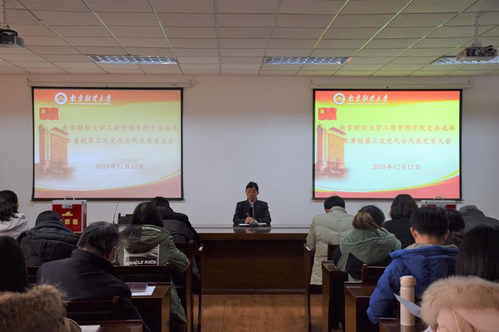 党委党员大会选举出席校第三次党代会代表选举办法(草案)》。第二项议程,审议通过了党员不计入应到会人数议案。第三项议程,大会通过了监票人名单。分别为杨华、吴忠、史敏,其中杨华为总监票人,同时宣布了计票人名单,为邱祥霞、吴丽敏、聂志平、赵菲。第四项议程,选举本单位出席校第三次党代会的代表。首先,万绪才书记宣布了10名出席中共南京财经大学第三次代表大会的代表候选人预备人选。其后,计票人员开始清点到会人数,领取并向党员分发选票,监票人检查票箱并加封。之后,万绪才书记宣读填写选票注意事项,全体党员有序进行投票。计票完毕后,总监票人宣布了选举结果。会议最终选取李群、万绪才、杨林、王瑛、刘永强、秦伟平、徐楠楠等七位同志为校第三次党代会代表。