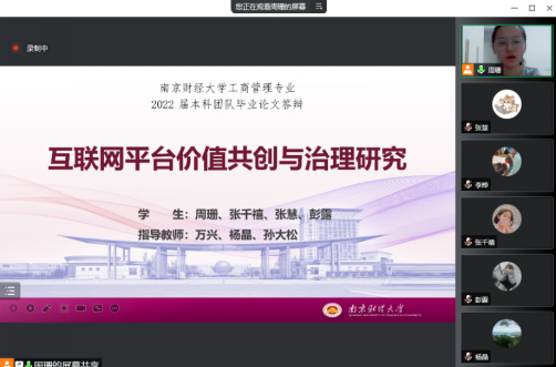 首先,秦伟平教授说明了答辩流程和要求;接着,飞速体育直播官网 本科论文团队项目的队长周珊同学从选题依据、团队合作、研究思路、主要结论与创新点五个方面进行详细汇报。周珊、张千禧、张慧与彭露四位同学合作研究的论文方向为互联网平台价值共创与治理研究,探究在平台、企业、消费者等主体共存的生态系统中,如何有效实现数据赋能与价值共创、如何应对消费者行为、如何实现企业绩效与平台治理共赢等问题。