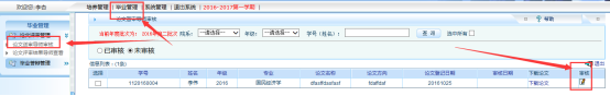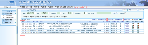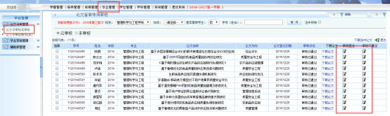 导师审核通过后,学院管理员用户可以进入校内平台,在【毕业管理】【论文评审管理】【论文送审院系审核】中进行审核。学院的审核工作务必在学校规定的时间内完成。