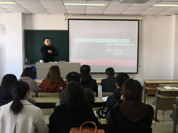 邀请,江苏景和睿策旅游规划设计研究院有限公司总经理储光博士在仙林校区博文楼414教室作了题为“我国旅游度假区发展困境与路径”的学术讲座。讲座由彭红松博士主持,旅游管理专业部分本科生、硕士生和教师聆听了讲座。