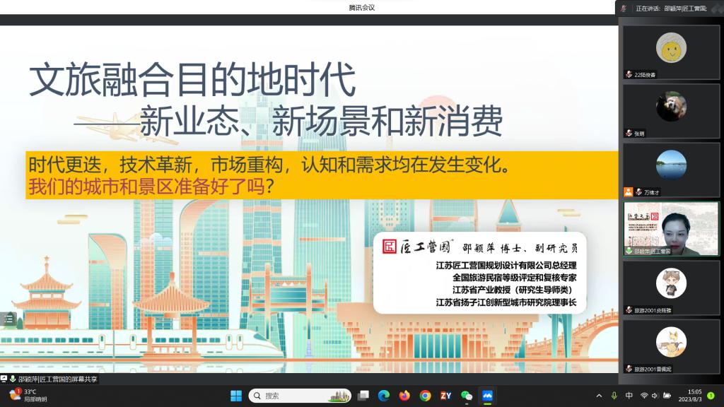 邀请,江苏匠工营国规划设计有限公司总经理、江苏省产业教授邵颖萍通过腾讯会议作了题为“文旅融合目的地时代:新业态、新场景和新消费”的讲座。讲座由飞速体育